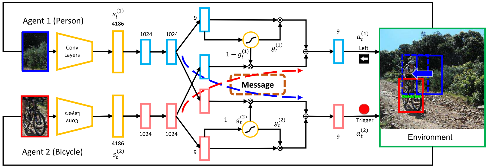 We examine the problem of joint top-down active search of multiple objects under interaction, e.g., person riding a bicycle, cups held by the table, etc.. Such objects under interaction often can provide contextual cues to each other to facilitate more efficient search. By treating each detector as an agent, we present the first collaborative multi-agent deep reinforcement learning algorithm to learn the optimal policy for joint active object localization, which effectively exploits such beneficial contextual information. We learn inter-agent communication through cross connections with gates between the Q-networks, which is facilitated by a novel multi-agent deep Q-learning algorithm with joint exploitation sampling. We verify our proposed method on multiple object detection benchmarks. Not only does our model help to improve the performance of state-of-the-art active localization models, it also reveals interesting co-detection patterns that are intuitively interpretable.
