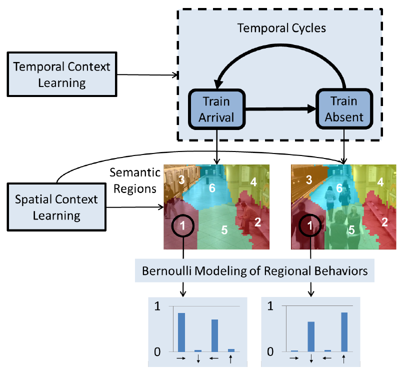 Modeling complex crowd behaviour for tasks such as rare event detection has received increasing interest. However, existing methods are limited because (1) they are sensitive to noise often resulting in a large number of false alarms; and (2) they rely on elaborate models leading to high computational cost thus unsuitable for processing a large number of video inputs in real-time. In this paper, we overcome these limitations by introducing a novel complex behaviour modeling framework, which consists of a Binarized Cumulative Directional (BCD) feature as representation, novel spatial and temporal context modeling via an iterative correlation maximization, and a set of behaviour models, each being a simple Bernoulli distribution. Despite its simplicity, our experiments on three benchmark datasets show that it significantly outperforms the state-of-the-art for both temporal video segmentation and rare event detection. Importantly, it is extremely efficient — reaches 90Hz on a normal PC platform using MATLAB.