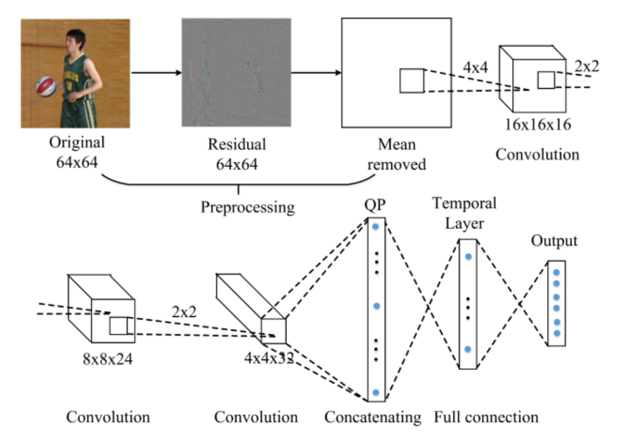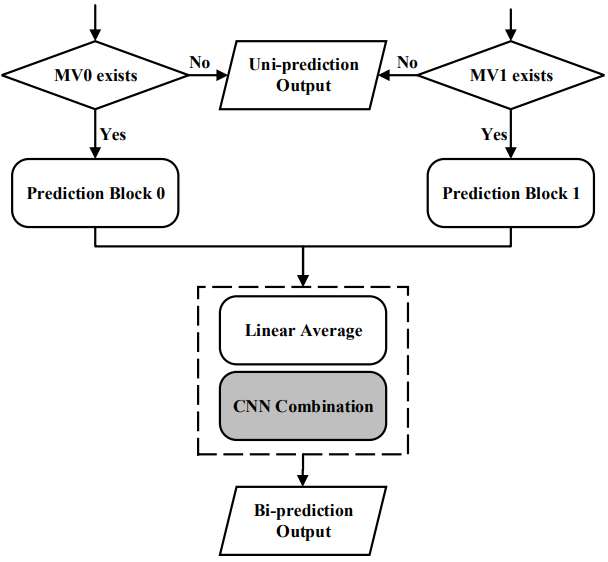 Figure 1 Top: The network architecture; bottom: the flowchart of CNN based bi-directional inter prediction in video coding