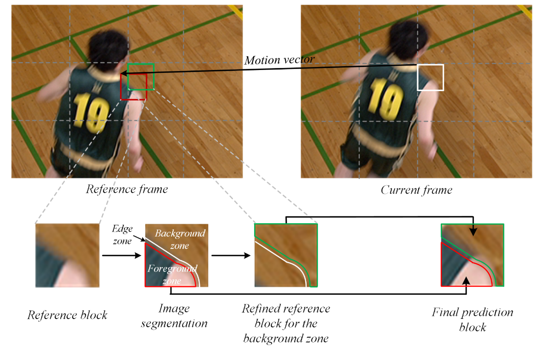 Motion compensation (MC) has been widely employed for removing temporal redundancies in typical hybrid video coding framework. To improve the performance of MC, a frame is usually divided into non-overlapped sub-regions as the basis to capture motion characteristics. However, block based MC may not align with the actual object motion boundaries, potentially limiting the compression efficiency. In view of this, we propose a three-zone segmentation based motion compensation scheme to improve the description accuracy of motion field as well as the coding efficiency. In particular, image segmentation is applied on the reference block to locate the object edges, and then the reference block is divided into three zones, including one foreground zone, one background zone and one edge zone. The background zone will obtain refined MV based on the local motion field, the prediction of the foreground zone is improved by the multi-hypothesis prediction and the edge zone is processed as an overlapped zone and the weighted compensated strategy is adopted in edge zone.