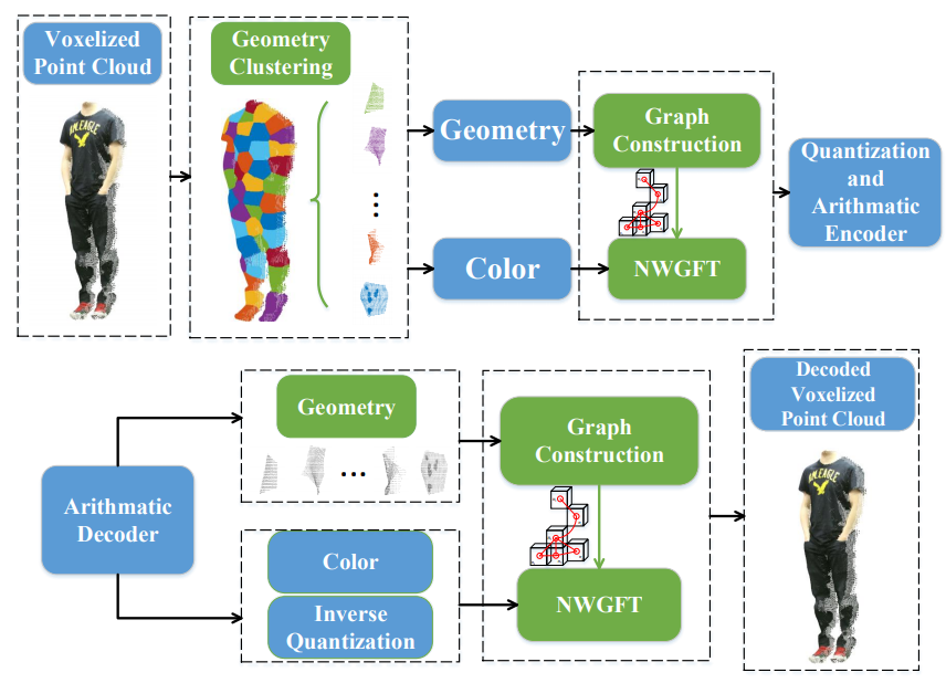 We propose a novel point cloud compression method for attributes, based on geometric clustering and Normal Weighted Graph Fourier Transform (NWGFT). Firstly, we divide the entire point cloud into different sub-clouds via K-means based on the geometry to acquire sub-clouds with more uniform structures, which enables efficient representation with less cost. Secondly, for the purpose of reducing the redundancy further, we apply NWGFT to each sub-cloud, in which graph edge weights are derived from the similarity in normal combining the local and global features of point clouds.