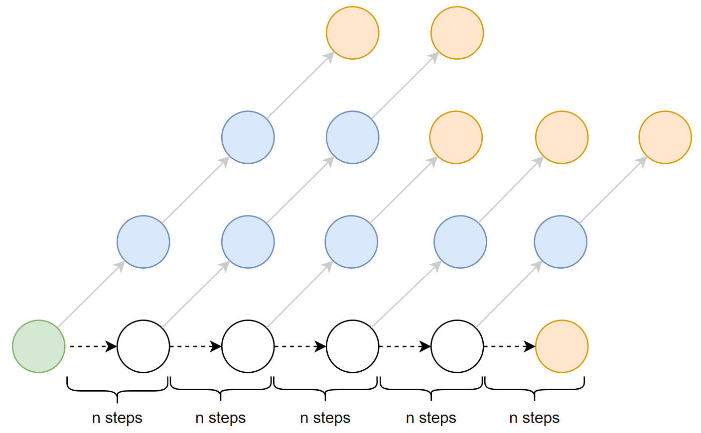Image captioning aims at generating natural captions automatically for images. Recently it has been shown advantages of incorporating techniques from reinforcement learning into training, where one of the popular techniques is the advantage actor-critic algorithm that calculates per-token advantage by estimating state value with a parametrized estimator at the cost of introducing estimation bias. Here, we estimate per-token advantage without using a parametrized value estimator. With the properties of image captioning, we reformulate advantage function by simply replacing the state value with its preceding state-action value. Moreover, the reformulated advantage is extended to n-step, which can generally increase the absolute value of reformulated advantage. Then two kinds of rollout are adopted to estimate state-action value, which we call self-critical n-step training. Empirically we find that our method can obtain better performance compared to the state-of-the-art methods that use the sequence level advantage and parametrized estimator respectively.