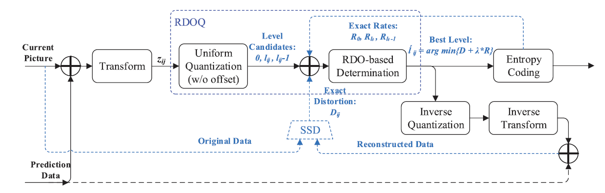 Rate distortion optimized quantization (RDOQ) is an efficient encoder optimization method that plays an important role in improving the rate-distortion (RD) performance of the high-efficiency video coding (HEVC) codecs. However, the superior performance of RDOQ is achieved at the expense of high computational complexity cost in two stages RD minimization. To reduce the computational cost of the RDOQ algorithm in HEVC, we propose a low-complexity RDOQ scheme by modeling the statistics of the transform coefficients with hybrid Laplace distribution. In this manner, specifically designed block level rate and distortion models are established based on the coefficient distribution. Therefore, the optimal quantization levels can be directly determined by optimizing the RD performance of the whole block, while the complicated RD cost calculations can be eventually avoided.