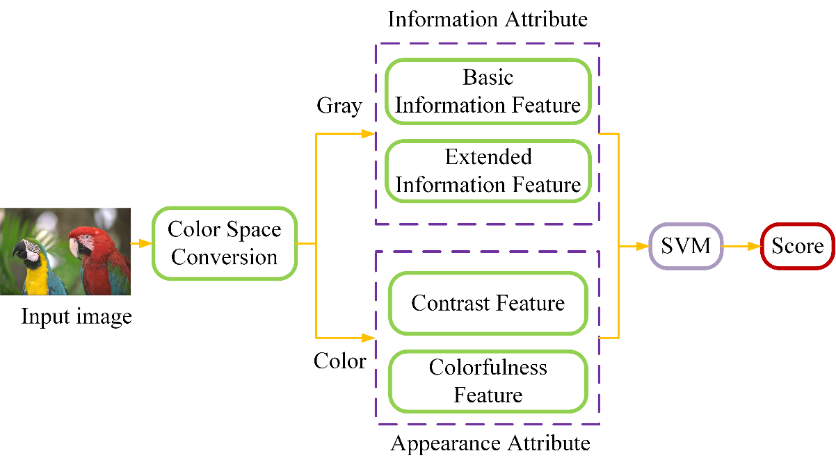 Contrast distortion has a significant influence on the perceptual quality of an image, which may be generated in various image processing procedures. We propose a no-reference image quality assessment (IQA) algorithm for contrast-distorted images based on hybrid features from information and appearance attributes. From information attribute aspect, we utilize the basic information feature to quantify the information of the visible part and the extended information feature further containing the invisible part of an image. From the appearance aspect, we propose an efficient perceptual contrast and colorfulness index to capture the direct visual changes. With the hybrid information attribute and appearance attribute features, support vector regression (SVR) is utilized to learn an IQA model to predict the quality of contrast distorted images. Extensive experimental results on CCID2014 and TID2013 databases further demonstrate the superior performance and robustness of the proposed method.