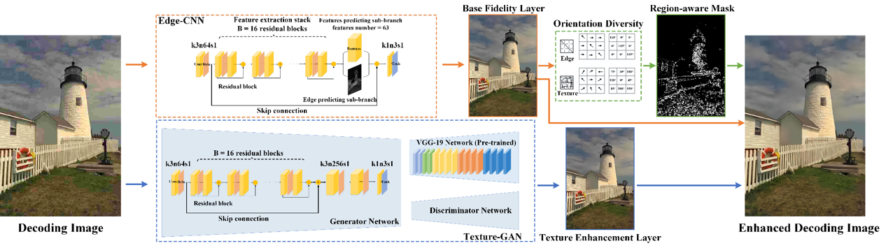 However, GANs always lead to poor objective results such as PSNR, which means low fidelity. Therefore, we further introduce a region-aware visual signal restoration scheme to achieve a good balance between visual quality and fidelity with hybrid neural networks, such that the base fidelity layer and texture quality enhancement layer are combined adaptively to restore the compressed images.