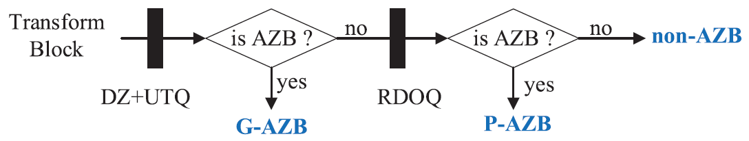 There are a large number of discrete cosine transform coefficients which are finally quantized into zeros. In essence, blocks with all zero quantized coefficients do not transmit any information, but still occupy substantial unnecessary computational resources. As such, detecting all-zero block (AZB) before transform and quantization has been recognized to be an efficient approach to speed up the encoding process. We incorporate the properties of soft-decision quantization into the AZB detection, instead of considering the hard-decision quantization (HDQ) only. In particular, we categorize the AZB blocks into genuine AZBs (G-AZB) and pseudo AZBs (P-AZBs) to distinguish their origins. For G-AZBs directly generated from HDQ, the sum of absolute transformed difference-based approach is adopted for early termination. Regarding the classification of P-AZBs which are generated in the sense of rate-distortion optimization, the rate-distortion models established based on transform coefficients together with the adaptive searching of the maximum transform coefficient are jointly employed for the discrimination.