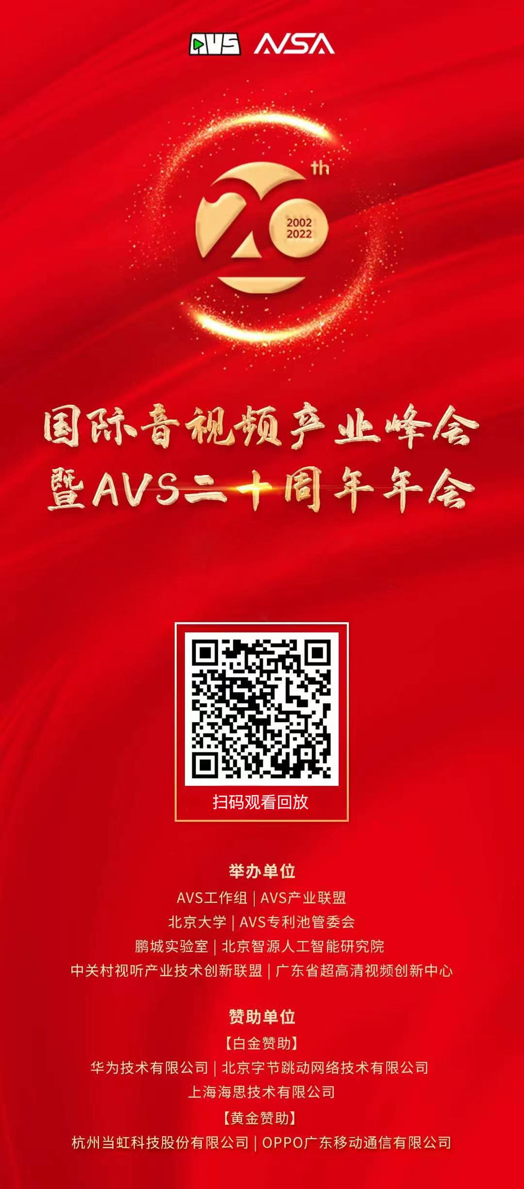 2022年12月9日上午,由AVS工作组、AVS产业联盟、北京大学等单位联合主办的AVS二十周年年会,以线上线下结合的方式成功举办。来自海内外的数字音视频产业专家、学者齐聚,共同回顾讨论了AVS二十年来取得的巨大成就,分享了AVS音视频标准的产业落地应用,展望了我国音视频技术和产业未来发展方向。AVS工作组授予了20家单位和个人“AVS 20周年20人荣誉获得者”称号,以表彰他们对AVS产业发展做出的突出贡献,发布了引领未来方向的《AVS发展规划2035》白皮书。