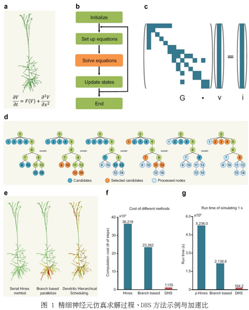 相比于点神经元,精细神经元的复杂性也意味着其仿真过程极其耗时。因此,该领域的科学家们一直面临一个关键问题:如何对精细神经元以及精细神经网络模型进行高效仿真?精细神经元复杂树突结构的仿真需要采用特殊的线性方程组求解,是影响仿真效率的基本瓶颈。当前主流大脑仿真平台(如NEURON)采用的海因斯算法(Hines method)由耶鲁大学海因斯1984年提出,计算复杂度高,造成精细神经网络仿真代价极其昂贵(图1),算力成为限制网络规模扩展的桎梏。近40年来,为了提高海因斯算法的计算效率,人们进行了不懈探索,但成效甚微,这个难题一直悬而未决。