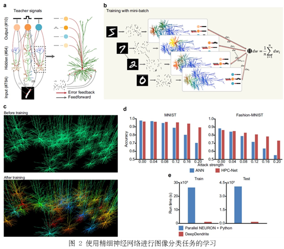 实现人工智能训练:精细神经网络仿真领域目前为止没有类似于PyTorch和TensorFlow一样的框架,DeepDendrite支持面向大数据人工智能训练的高效批处理学习,构建了多层精细神经网络HPC-Net支持典型的图像分类任务,训练时间比现有仿真平台提速约25倍(图2)。训练得到的精细神经网络在分类准确性与人工神经网络基本一致的情况下,对抗噪声的鲁棒性显著提升,展现了精细神经网络相比当前人工神经网络的巨大潜力。