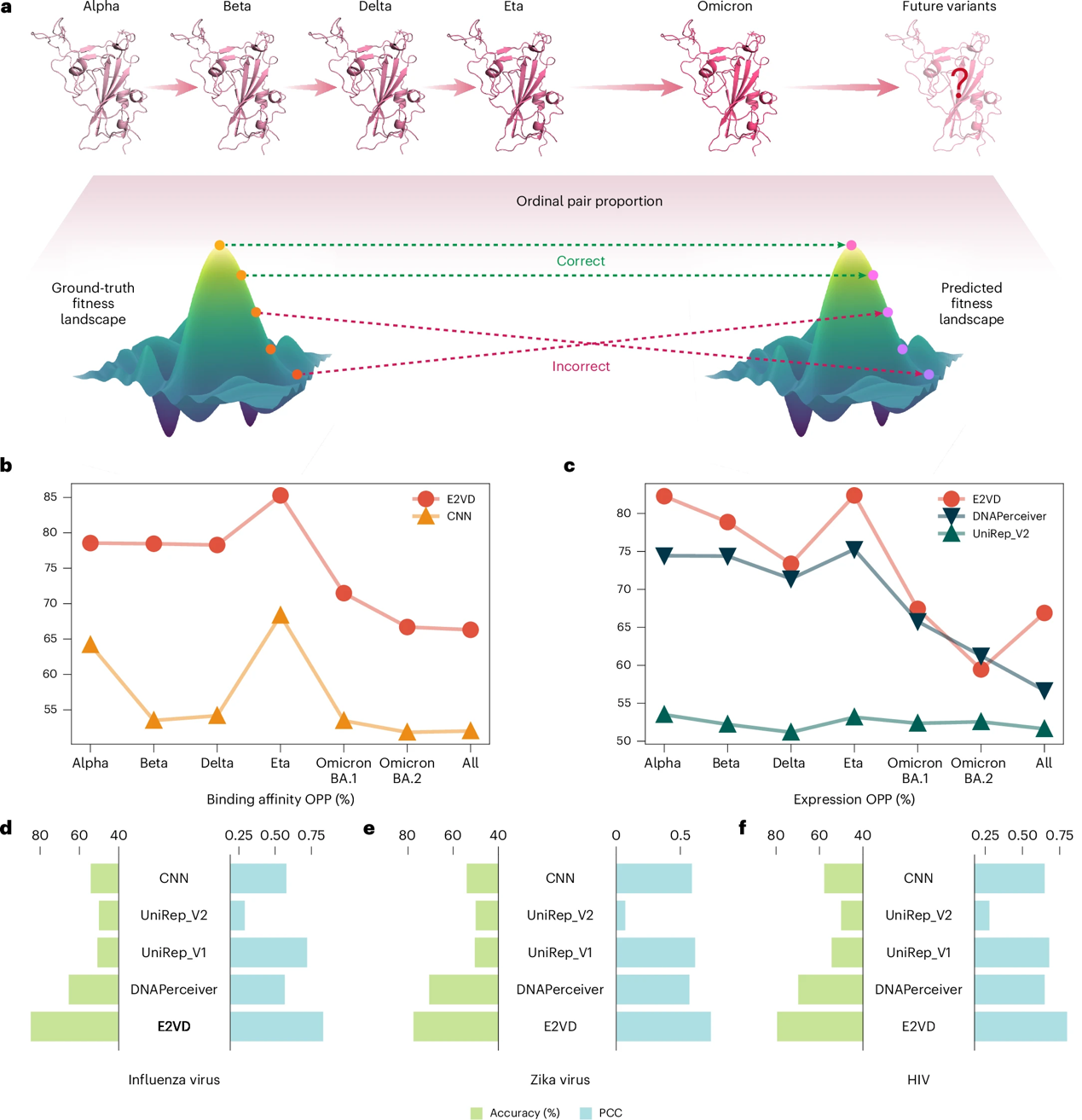 此外,E2VD在跨越病毒类型和毒株类型时展现出强大的泛化能力(图3)。研究团队提出鲁棒且避免实验批次效应影响的突变所致病毒适应度变化评估指标,并以此评估了模型在同病毒类型的不同毒株之间以及不同病毒类型之间的泛化表现,E2VD在新冠病毒、寨卡病毒、流感病毒以及艾滋病病毒上展现出理想的泛化能力,始终超越其他方法,未来可进一步拓展至更多传染性病毒,与疫苗和蛋白类药物设计流程相结合,有望提升设计效率和设计可控度。