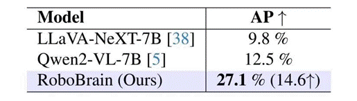 -可操作区域感知:我们采用平均精度(AP)指标来评估模型的可操作区域感知性能,该指标综合了不同阈值设置下的精度-召回曲线。在AGD20K可操作区域感知测试集上,RoboBrain的表现显著优于其他模型,分别超越Qwen2-VL和LLaVA-NeXT 14.6分和17.3分,验证了其在理解指令和物体物理属性方面的能力。