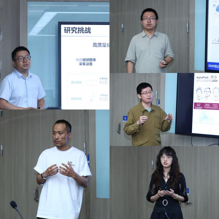 在专题技术报告环节,中心三个研究部分别汇报了最新代表性成果。视频研究部贾川民汇报了多模态数据智能编码研究进展,展示了AVS4标准预研探索和沉浸式视频会议系统;视频研究部卢宗青介绍了利用互联网视频数据驱动人形机器人和具身智能学习的最新研究;视觉研究部余肇飞汇报了脉冲视觉计算最新进展,包括高速场景重建和专用领域系统应用;智能研究部陈杰分享了多模态大模型在蛋白质计算中的前沿成果。参建单位华为技术有限公司陈馨瑶主任工程师从产业角度探讨了AI编解码技术的挑战与未来方向。