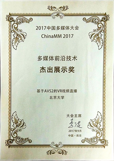 团队研制的AVS2超高清实时编码器中标广科院“超高清电视与裸眼3D电视实验平台”建设项目。基于AVS2的VR直播系统获2017年 ChinaMM 杰出展示奖。