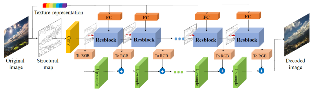 图像纹理提取器则基于变分自动编码器设计,由几个残差块和卷积层构成,它将输入图像I建模为后验多元高斯分布, 纹理表示从后验分布中使用重参方法采样得到。随后通过标量量化和熵编码进一步压缩提取的纹理离散表示。
