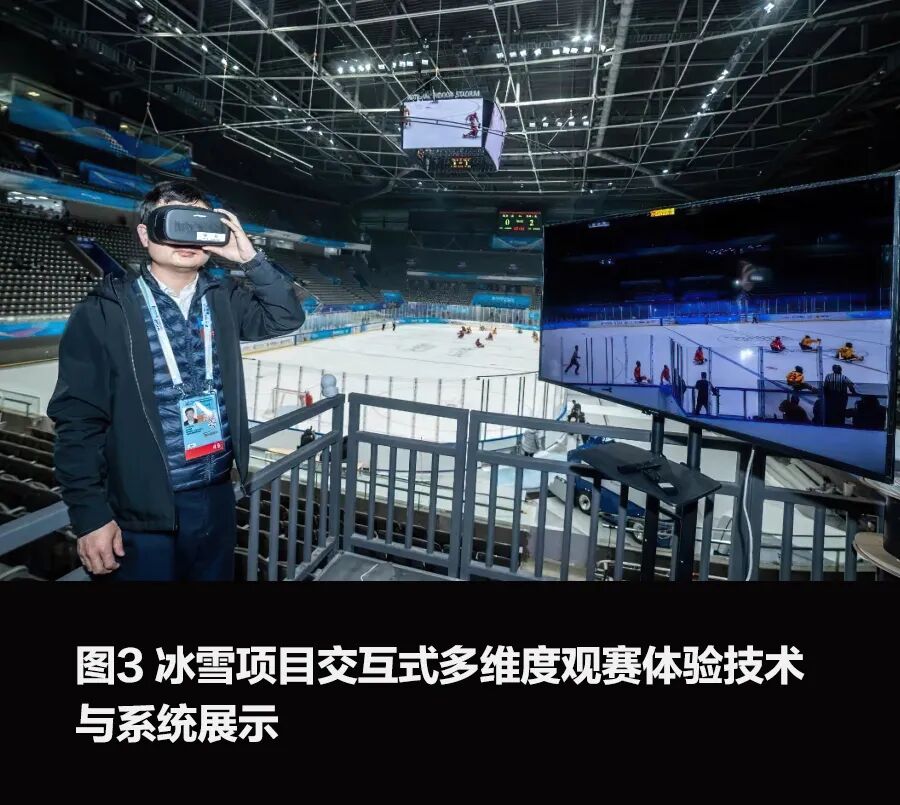 除了追求8K超高清带来的视觉效果、呈现史上“最清晰”冬奥会之外,北京2022年冬奥会更是成为追求“最沉浸式”观赛感受的历史转折点。为打造冰雪项目交互多维度观赛体验,基于北京大学牵头的国家重点研发计划“科技冬奥”专项项目课题,研究团队利用人工智能技术进行虚拟视角合成和三维场景实时重建,研发冰雪项目交互式多维度观赛体验技术与系统(见图3)。借助虚拟现实设备和移动终端等平台,观众可获得接近360度旋转的“自由视点”沉浸感。此外,该系统也将为未来高水平赛事转播标准的建立提供重要参考。