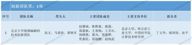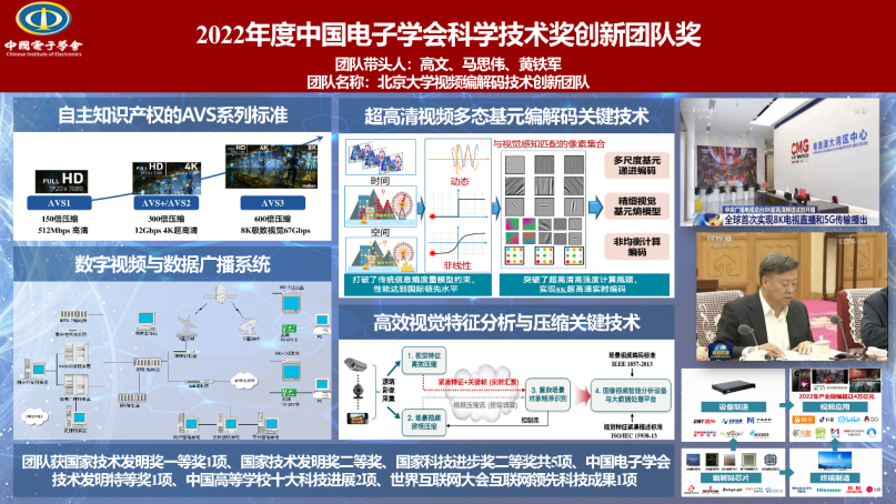 2023年2月21日,中国电子学会发布中国电子学会科学技术奖励公告。以北京大学视频与视频技术国家工程研究中心高文院士、马思伟教授、黄铁军教授为团队带头人的视频编解码技术创新团队(以下简称“创新团队”)荣获“中国电子学会科学技术奖创新团队奖”。
