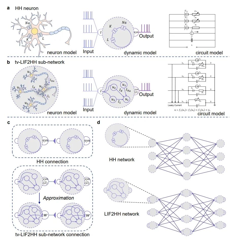 本研究首先展示了脉冲神经网络神经元LIF(Leaky Integrate and Fire)模型和HH(Hodgkin-Huxley)模型在动力学特性上存在等效性,进一步从理论上证明了HH神经元可以和四个具有特定连接结构的时变参数LIF神经元(tv-LIF)动力学特性等效。基于这种等效性,团队通过设计微架构提升计算单元的内生复杂性,使HH网络模型能够模拟更大规模LIF网络模型的动力学特性,在更小的网络架构上实现与之相似的计算功能。