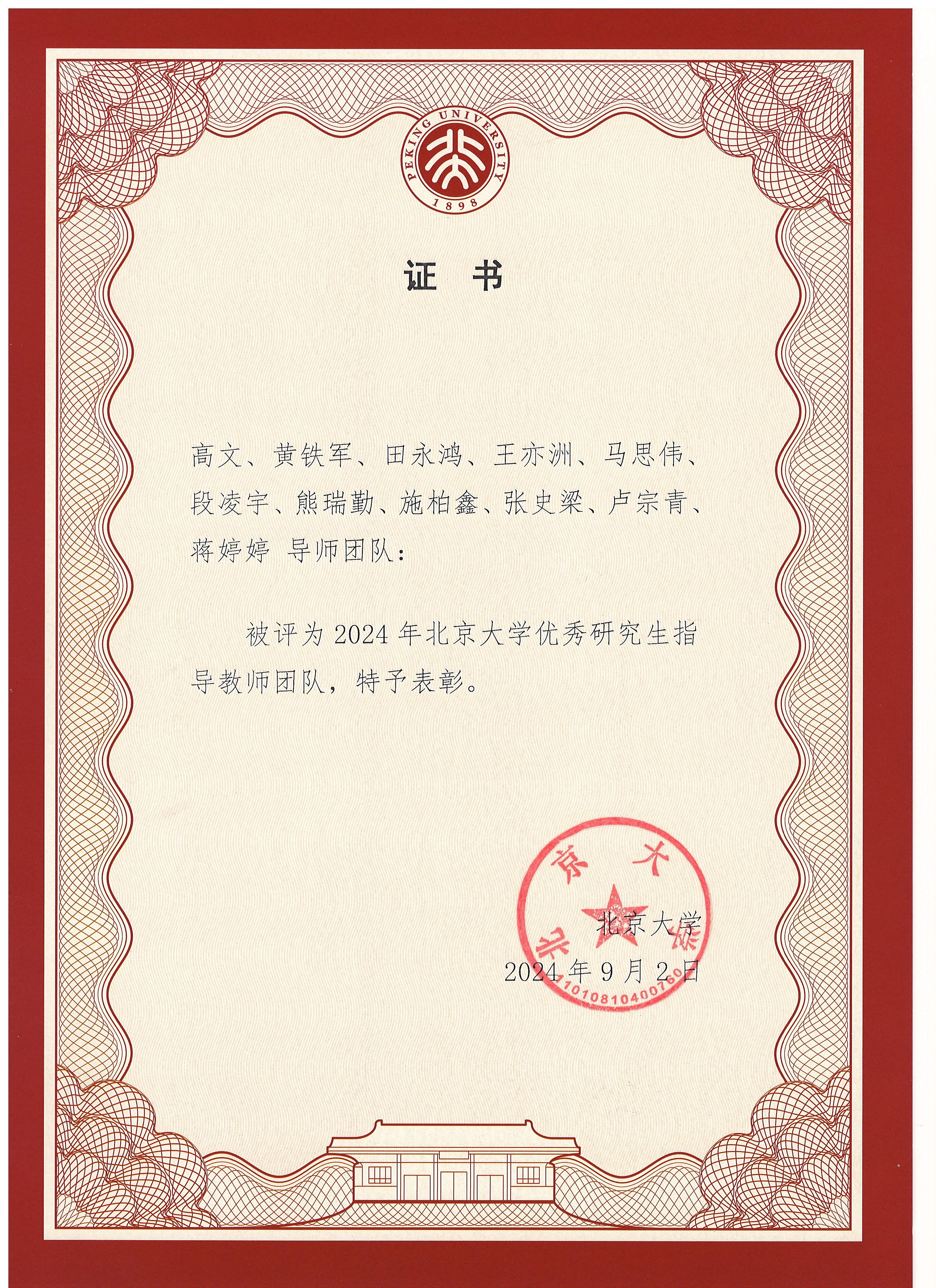 2024年北京大学优秀研究生导师及团队评选结果揭晓,中心主任高文院士带领的视频与视觉技术研究生导师团队荣获“北京大学优秀研究生导师团队”,导师团队主要成员如下:高文、黄铁军、田永鸿、王亦洲、马思伟、段凌宇、熊瑞勤、施柏鑫、张史梁、卢宗青、蒋婷婷。